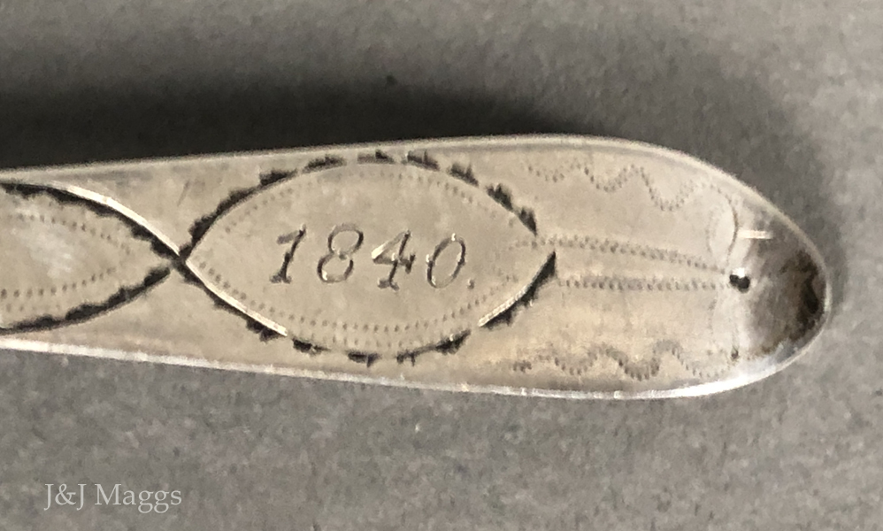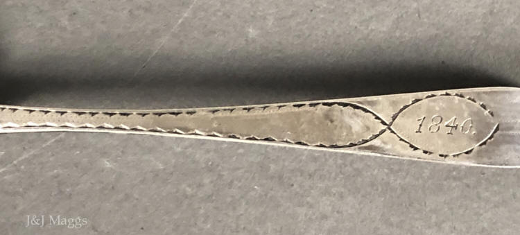 A lovely example of the form, with a petite bowl joined at its rear to an ornate handle. The handle has been engraved with the date 1830.