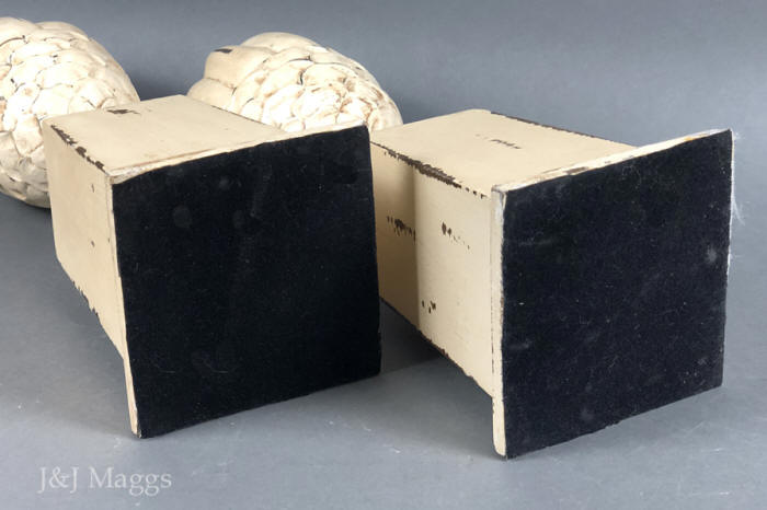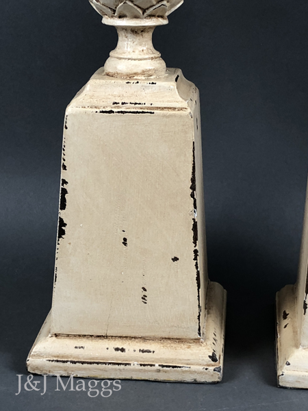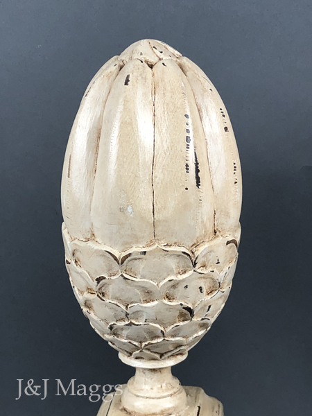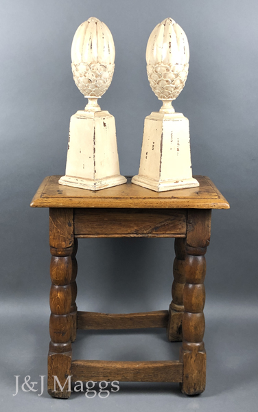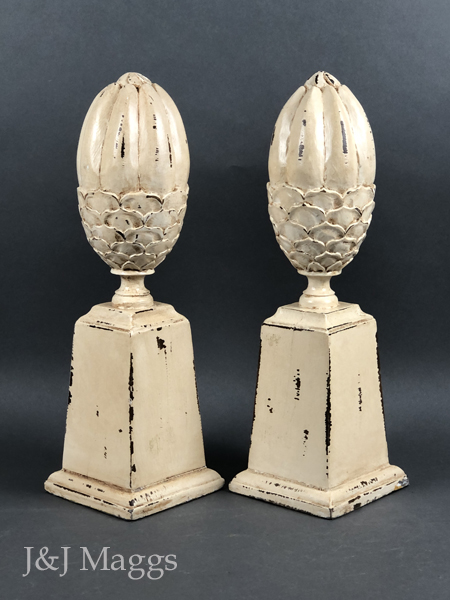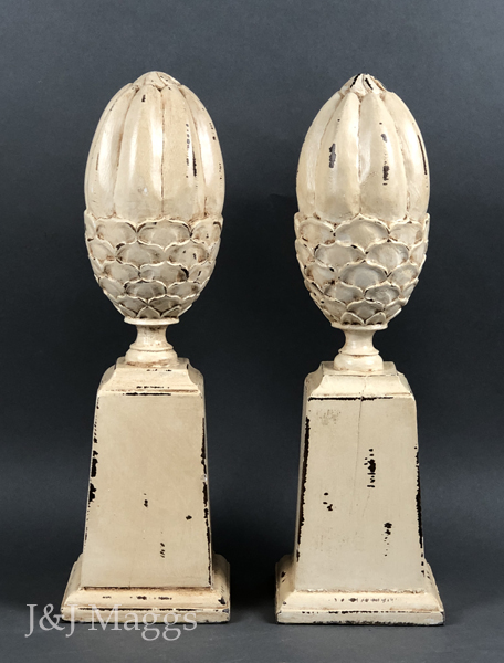 An interesting pair of decorative objects. The pineapples, though very similar, have enough differences in detail to indicate that they were carved by hand. The dark brown wood peeks out occasionally through the off-white paint that covers the surface. A square of thin felt has been added beneath each to cushion them from harming the surface upon which they sit.