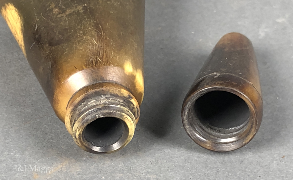 An exceptionally fine horn powder flask, made to fit the hand. The barrel was formed from a length of nicely figured horn, secured at the bottom by a small oval oak plug, which is attached to the body of the flask by four small brass nails. It is topped by a turned horn lid, decorated with two scribed rings. The flask and its lid are fastened by a coarse thread.
