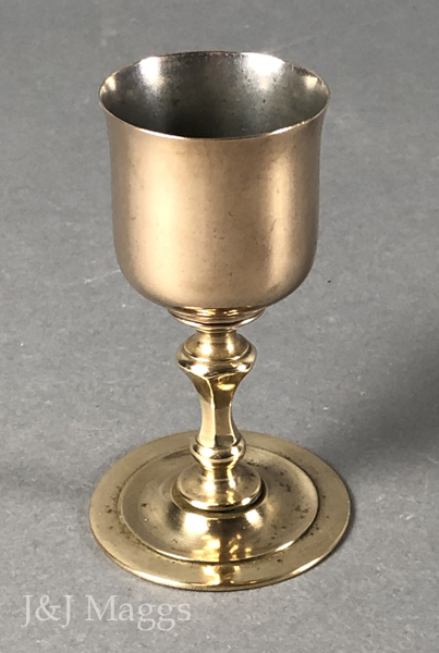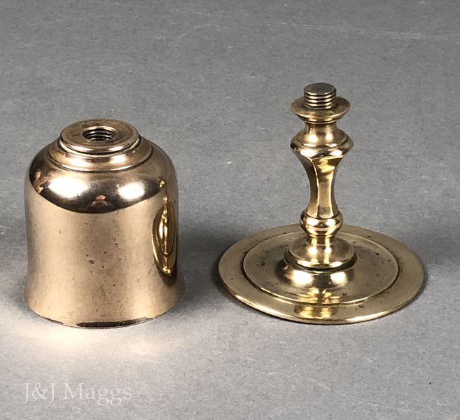 A fascinating object, probably from the transportable gear of a cleric’s baggage, used perhaps in administering the sacraments to a home-bound believer. The two halves, stem and bowl, are threaded so as to be assembled alternately in its useable or transportable form. We’ve had several of these over the years, but this is the only one with this particular shape. Also, we have never seen one with a tinned interior.
