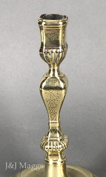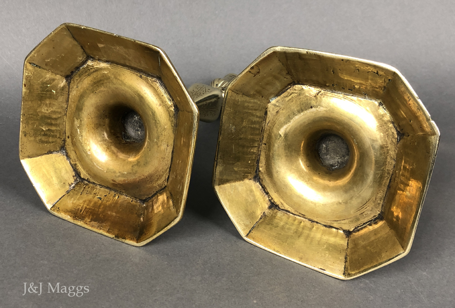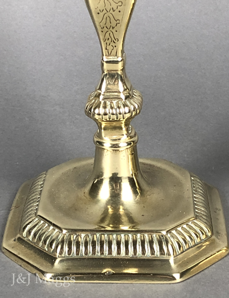 Octagonal, stepped bases, with gadrooning around the upper step support gracefully formed shafts, which were cast in two longitudinal halves and then joined together flawlessly, leaving a nearly invisible seam from bottom to top. The shafts are impressively designed, with a knop near the bottom, a baluster above it, and a shaped candle socket at the top. The knop and the bottom of the socket are gadrooned, like the base, and the baluster and the upper part of the socket are engraved brilliantly. The octagonal form of the base is continues through the entire length of the shaft.