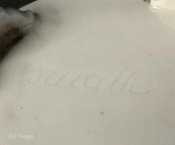 Excellent condition, with ink stains on top. Signed in illegible cursive on the underside “Bucelle”?