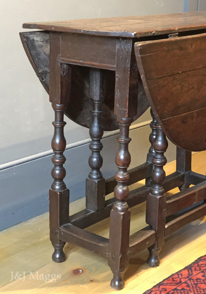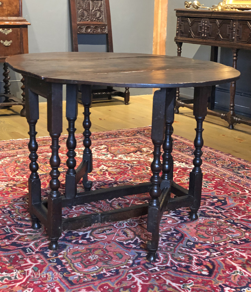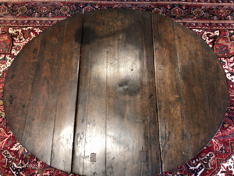 A petite table with exceptionally attractive ball and ring turnings and original button feet. The top is worn and stained, but it is all original. A charming and useful table.