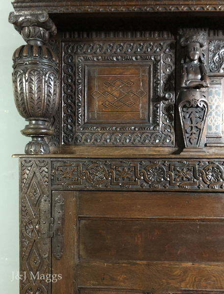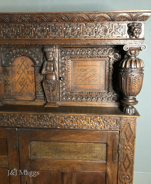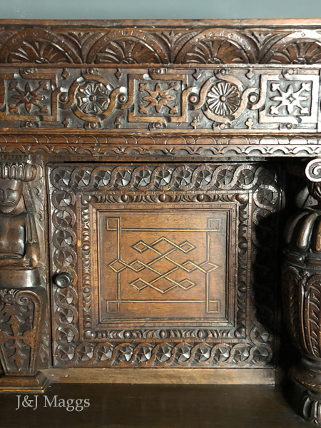 Without doubt, the most lavishly decorated court cupboard we’ve ever owned, and the quality of the carving is exceptional. The piece is in two sections, each crowned by a frieze in which alternating circles and rectangles frame three floral figures: the Tudor rose, a multi-petalled flower, perhaps a daisy; and a third, more abstract than the other two. The upper and lower friezes are identical but for the pair of lions that frame the upper.