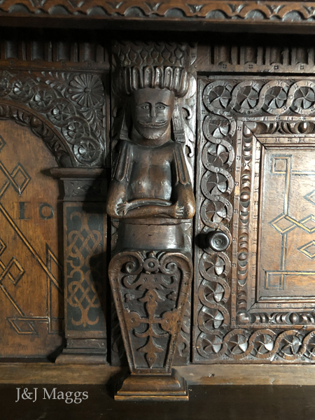 The central panel is framed by two crowned caryatids standing behind a lectern carved with festive flowers and scrolls. Based upon the date, it is possible that they represent James I and his Queen, Anne of Denmark. The floral emblem of the Danish crown is the daisy!