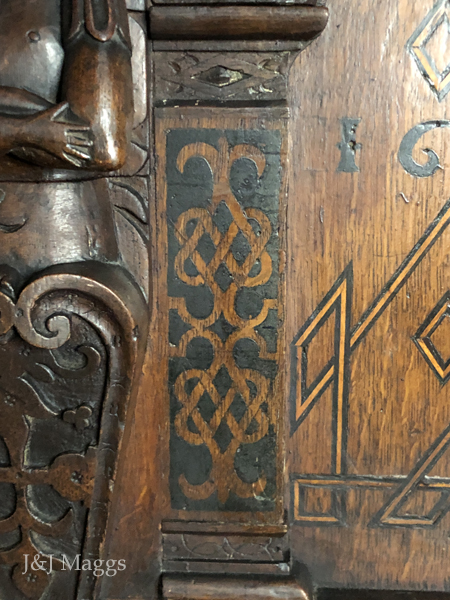 Between the two friezes and appearing to support the upper one are two large, densely carved cup-and-cover posts with scrolls at their tops. Just inside the posts are two square doors, each with a joined frame of carved running guilloches and three additional bands of carving. Each of these two frames supports an oak panel decorated with inlaid ebony and holly in an elaborate and symmetrical geometric arrangement. The doors are hinged in the standard way for the period – invisible iron pins – and both are intact. Behind the cup-and-cover posts, and nearly invisible, is a new carved motif consisting of elongated vertical diamonds which appear to be joined by carved rings.