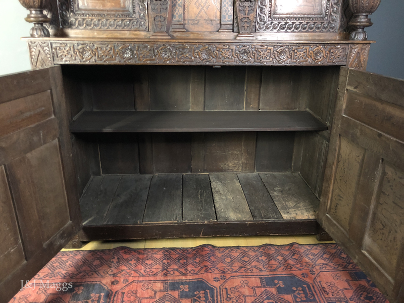 It is remarkable that this four hundred-year-old piece has come down to us in such outstanding condition. With the exception of two of the seven floorboards of the lower section and the medial shelf (added by us to replace the lost original with no attempt to conceal), it is all original.