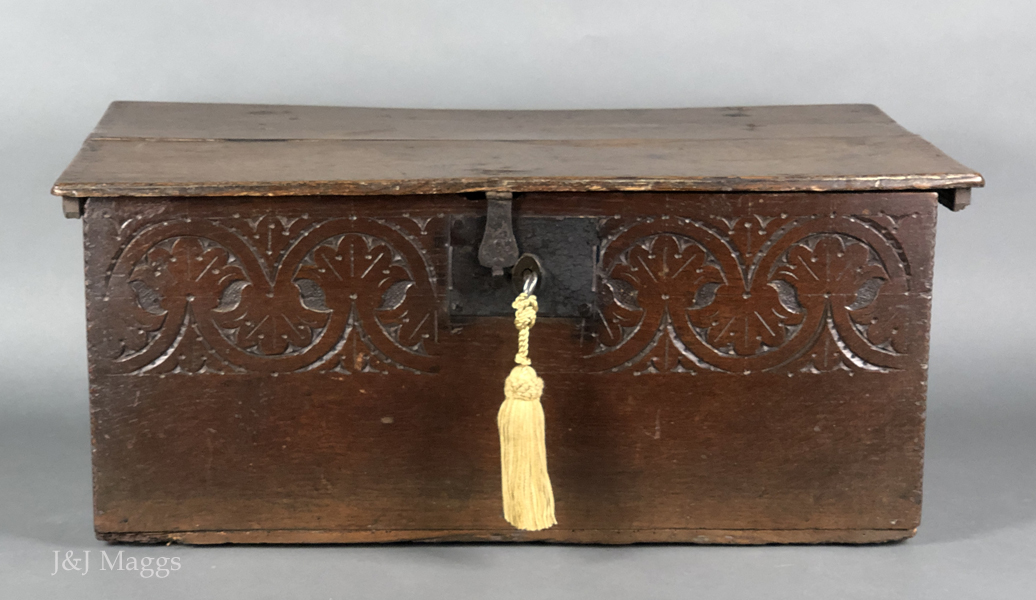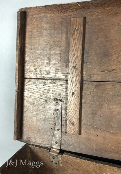 A deep box with shallow carving on its upper half and chip carving at the ends of its face. Perhaps its most remarkable feature is its back, which has bowed to such a degree that the hinges were pried from it. Fortunately, these original strap hinges were still present, although dysfunctional, and have been re-attached and are now functioning. The hasp and the working lock are also present. The outer cleats have been replaced, and two additional cleats have been added for stabilization.