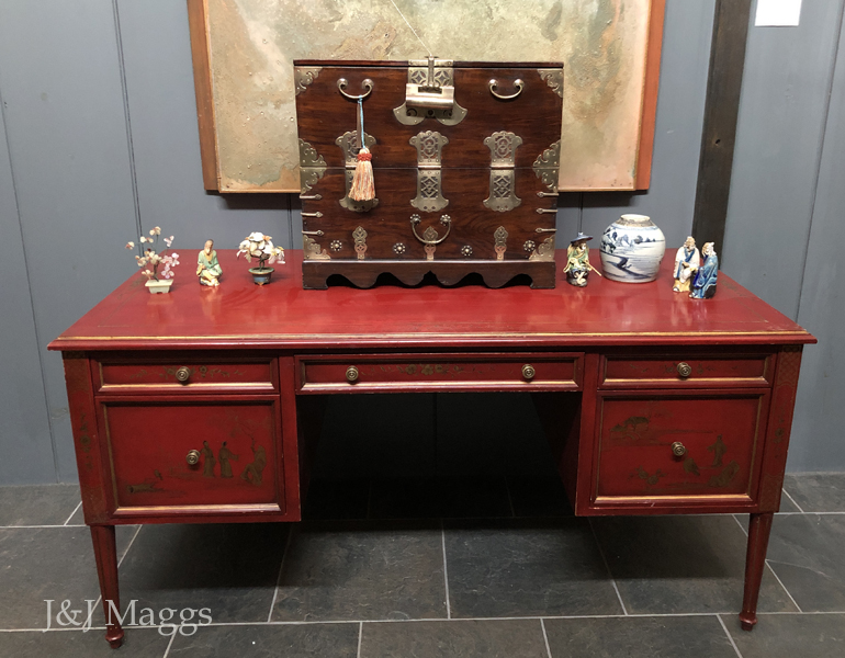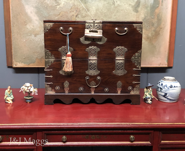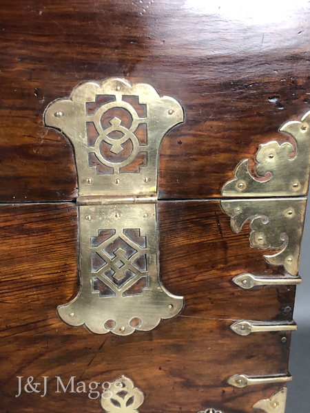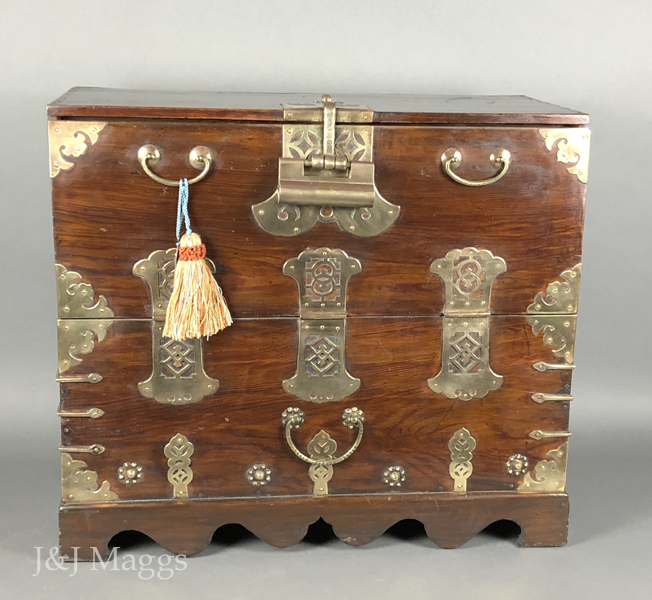 A traditional antique Korean Bandaji (“half-closing”) blanket chest, with two shallow interior drawers for storing valuables. The face is comprised of a stationary bottom board, secured by five brass fittings on each side. A string of purely decorative brasses lines its bottom, and three elaborate brass hinges connect the top to the stationary bottom, allowing it to swing forward and down to give access to the interior. At the top of this door are two bales and an elaborate, working lock. These chests are typically associated with the Joseon Dynasty; this one dates from the 19th century.