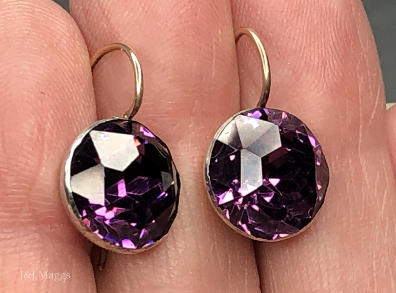 The sparkling starburst faceted amethyst pastes are lovely, and measure 11mm in diameter. They are closed back, bezel-set in silver with rounded backs typical of the Georgian period. They have gold shepherd’s crook earwires which go in the front of the ear. They measure ⅞” from top to bottom.