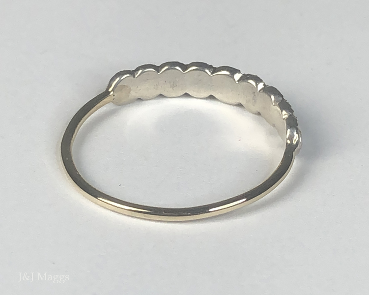 A stunning half-hoop ring in 15k gold, closed-back set with nine rose-cut diamond stones in rub-over bezel settings. There is slight graduation in size of the diamonds; from the center stone, the stones on each side graduate to a simple D-shaped gold band at the shoulders. Currently a size 7 ¾, this ring is glorious worn alone, or as a wonderful addition to a stack.