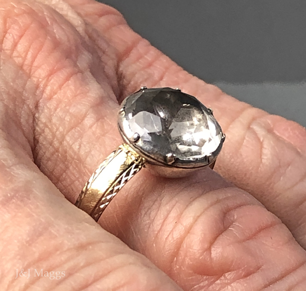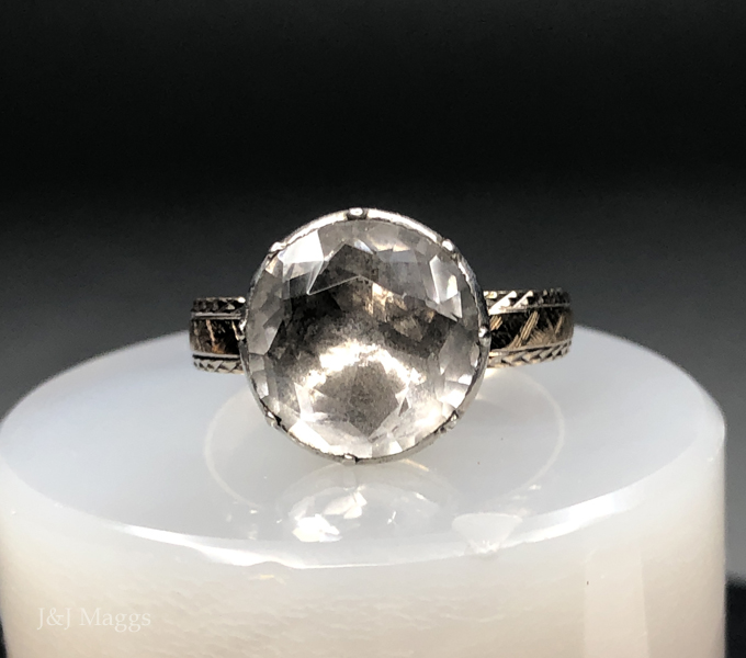 This beautiful Georgian ring has been closed back set in silver with a starburst faceted, round, foiled rock crystal stone. The crystal measures 12mm, and is bezel set with crimping at 8 points. The back of the stone setting has a rounded belly typical of Georgian pieces. The engraved gold shank joins the mount at the shoulders and tapers to an undecorated verso. The ring is English, and measures size 7-8.