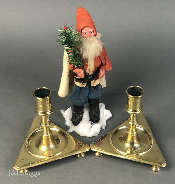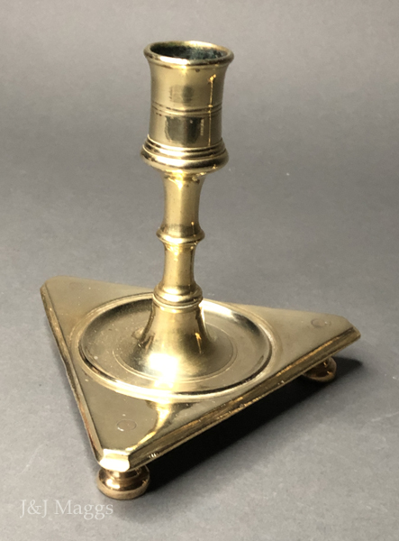 An atypical form, similar to the familiar square-base sticks from the Low Countries in the 17th century. The short, knopped shafts support well-formed candle sockets, and the bottoms of the shafts are coarsely threaded to engage the matching threads in the bases. The triangular bases are supported by three small feet, joined to the bases by tenons, the outlines of which are visible from above.