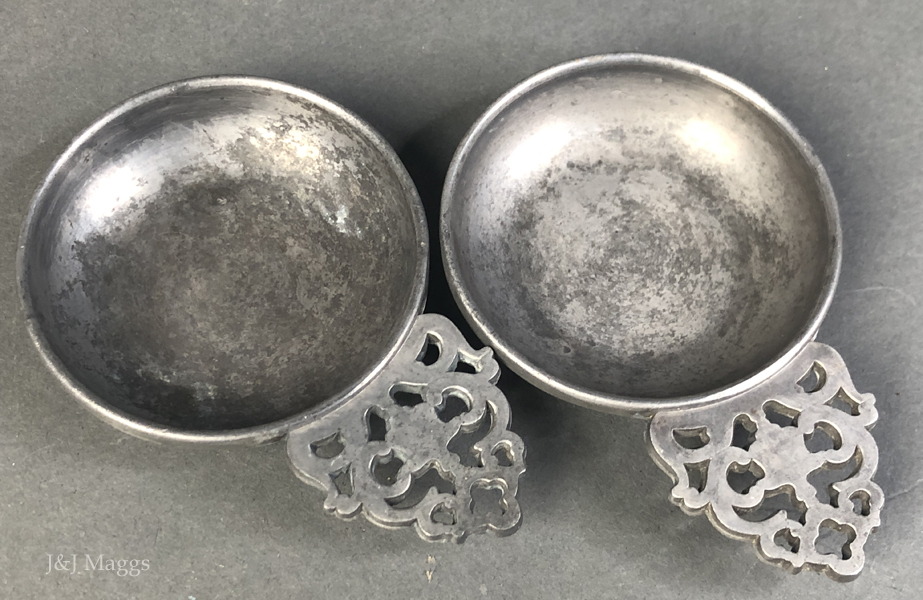 A pair of miniature pewter porringers