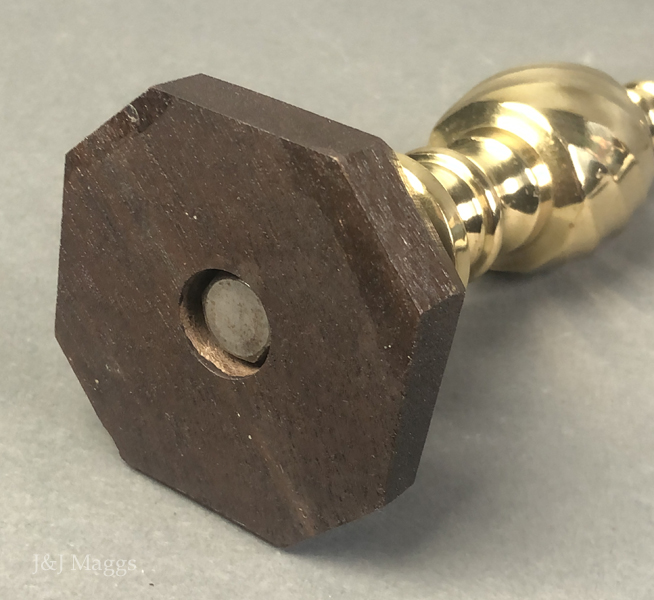 A striking brass finial, supported by an octagonal wooden base.