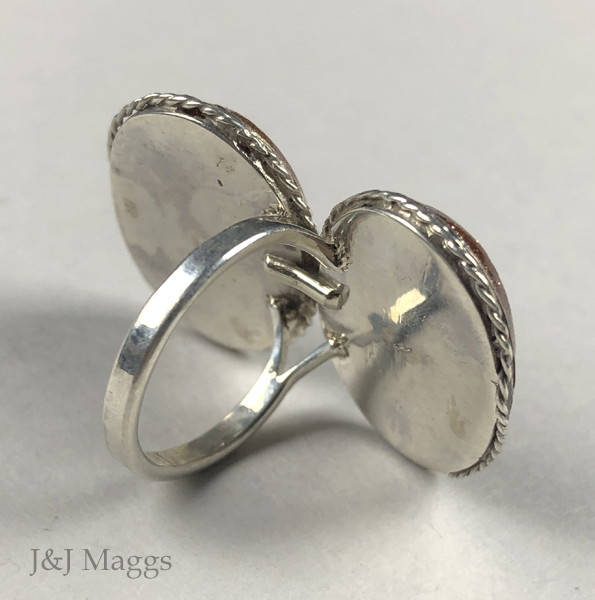 A truly classic English so-called “Queen Anne” silver mounted flat-cut goldstone earring transformed into a ring at some past time. This piece, most likely converted when its mate was lost, or when a pair of earrings was the most important possession of a woman who wanted to pass her jewels to two daughters—what to do? A “make-do” ring with a pair of flat-cut goldstone stones closed-back set in silver.