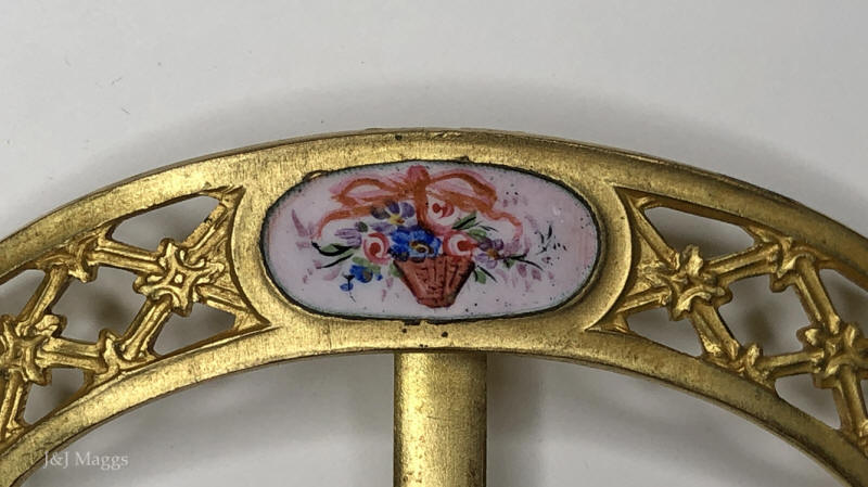 A beautiful French enameled gilt buckle in lovely condition, measuring 3 ½” wide, 2 ¾” high. An oval decorative, pierced design, with a central flat bar for fabric. There are four enameled cartouches of floral arrangements in ribboned baskets. French, 19th century.