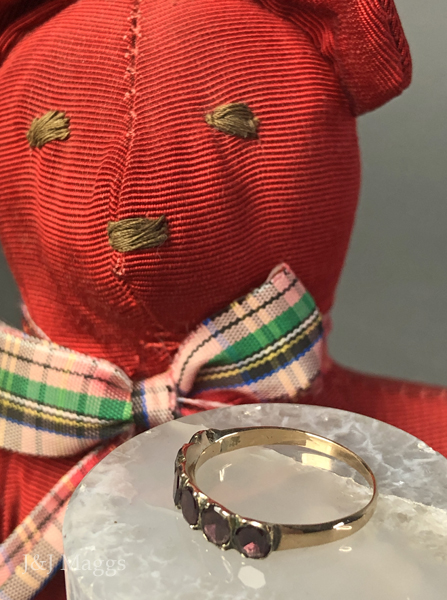 A lovely half-hoop ring in gold, closed-back set with six flat-cut garnet stones (4mm) paw-set in gold bezels. A simple, tapered D-shaped gold band joins at the shoulders. Currently a size 6½, this English, Georgian ring is a wonderful addition to a stack, or beautiful worn alone.