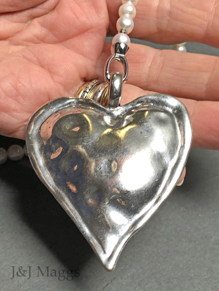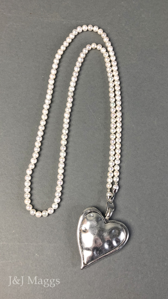 A long (33”) strand of white, freshwater pearls (6mm), with a large sterling silver heart pendant (2 ½” top to bottom x 2” wide), which may be worn in various ways. Both ends of the strand have snap clasps to allow varied styling, by removing the heart, or adding your own drops and charms. Most likely contemporary, and great fun.
