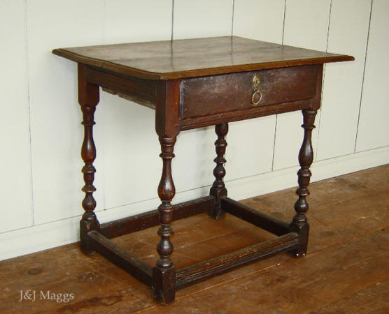 As she extolled her husband's antiquarian credentials ("fifth-generation dealer -- buys regularly from estates and at sales -- very knowledgeable"), we noticed a small, beautifully-proportioned 17th-century stretcher-base table, on top of which was an oak bible box of comparable age. We approached the table and examined the tag that hung from the drawer, anticipating a price that we couldn't afford, and were shocked to see that we could. We searched in vain for faults that would explain the reasonable price and found only two old and quite insignificant repairs. Likewise, the bible box was in "as found" condition.