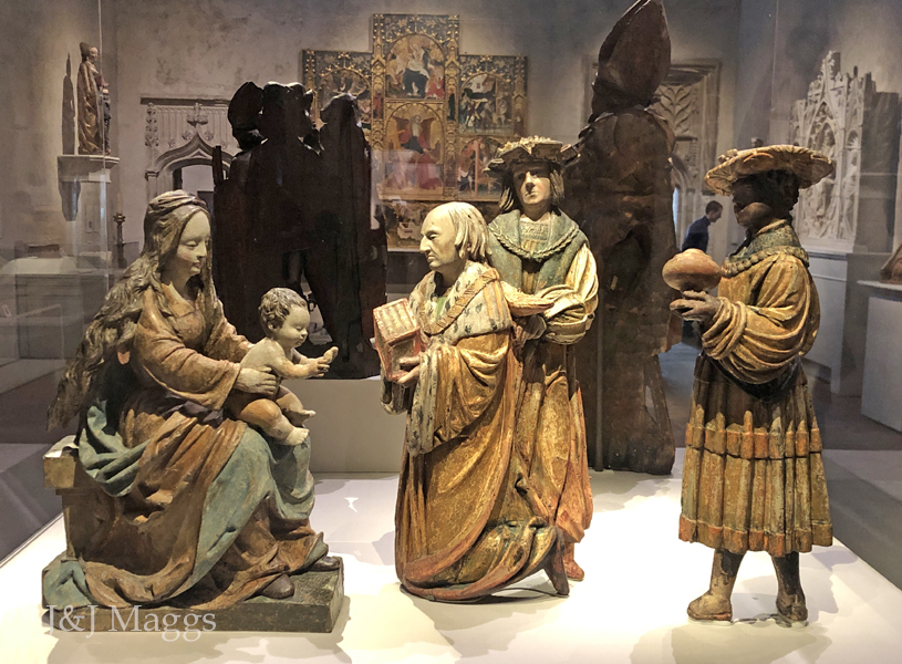 The polychrome wood sculptures depict the three wise men from the East presenting gifts to the infant Jesus and his mother, Mary.