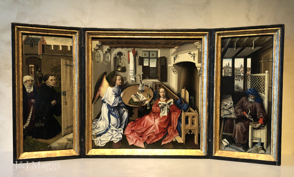 Virgin Mary, while the side panels show the donors and Saint Joseph working