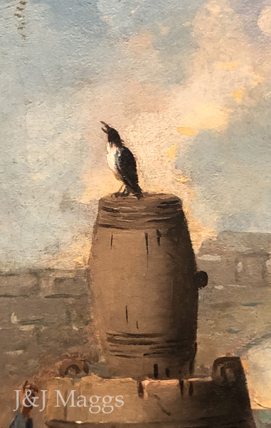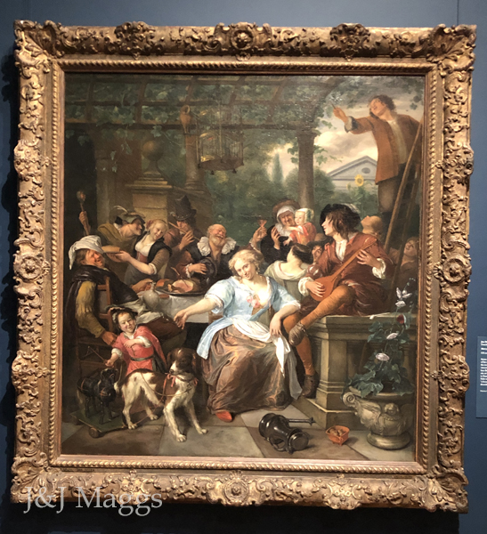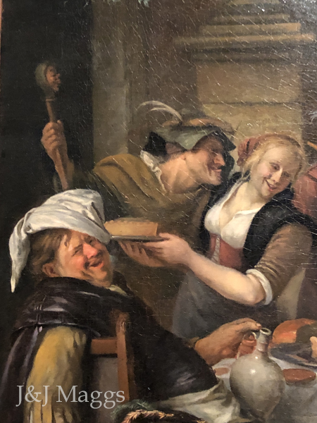 Detail from Merry Company on a Terrace, with a self portrait of the artist making advances toward the young hostess who is trying to serve a slice of pie to a reveler.