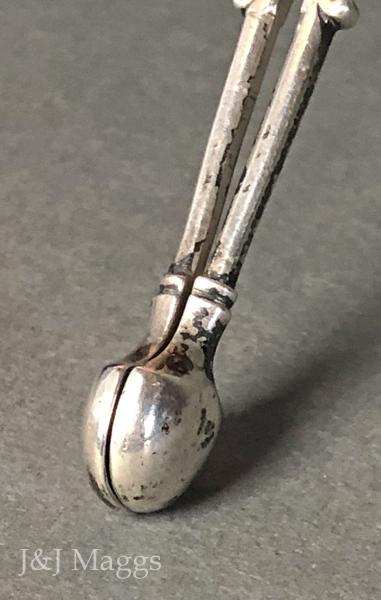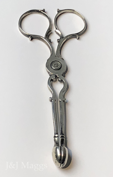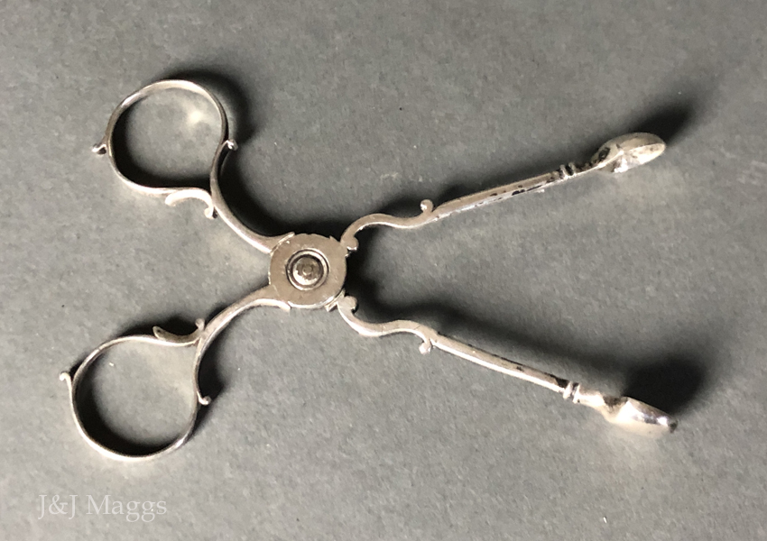 Purchased in New England from the estate of a sophisticated, English-born American collector, this pair of tongs is artfully made and in fine condition. Seraphs adorn the handle and the descending shafts. Each half of the set is stamped with a lion passant and the initials WG.