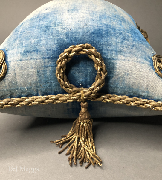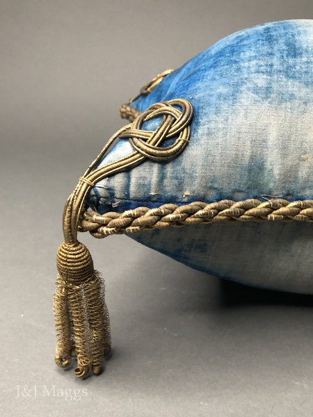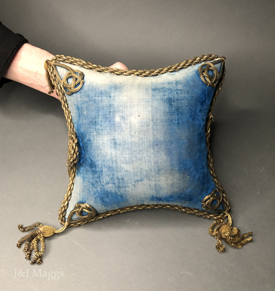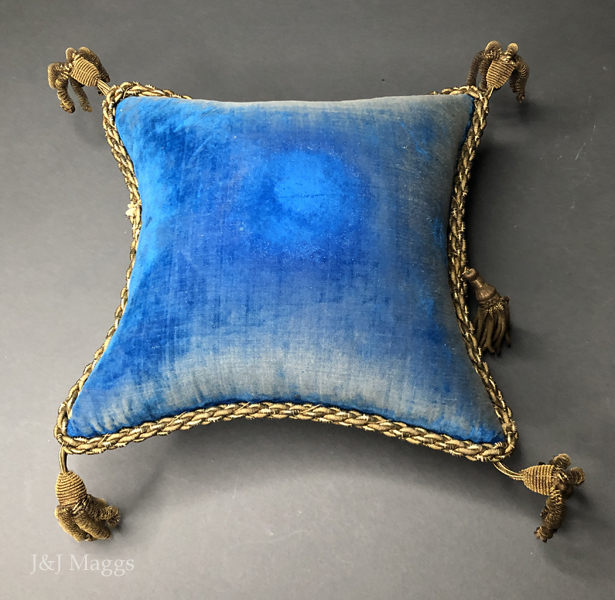 This wonderful cushion consists of a firm covering of blue silk velvet which encloses a hard, horsehair stuffing, domed at the center top and slightly flattened at the bottom. Its embellishment: gilt metallic adornments are hand sewn, at each corner an extravagant knot formed by three gilt metallic braids which attach to a large tassel. At the front there is an arched circle of scalloped gilt metallic braid above and below the medial braiding, forming another circle.