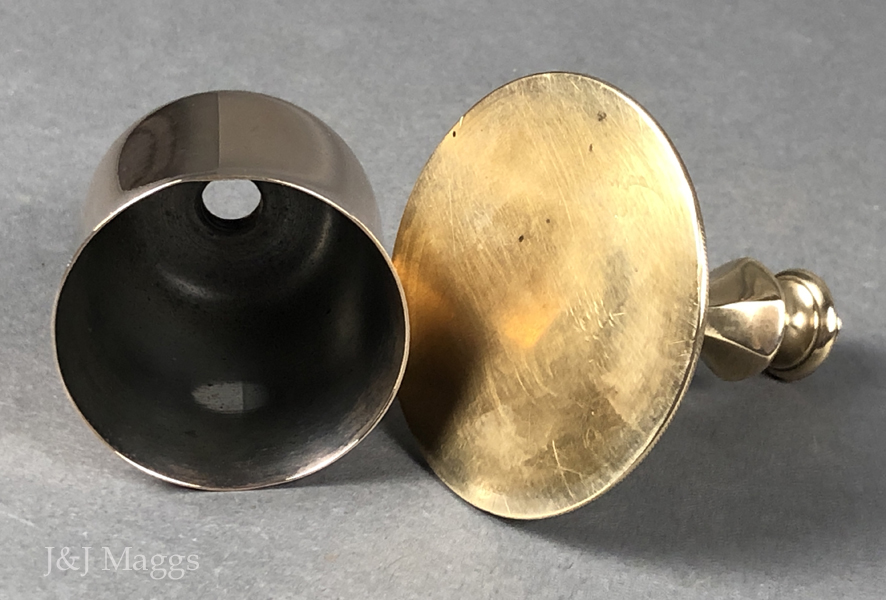 A fascinating object, probably from the transportable gear of a cleric’s baggage, used perhaps in administering the sacraments to a home-bound believer. The two halves, stem and bowl, are threaded so as to be assembled alternately in its useable or transportable form. We’ve had several of these over the years, but this is the only one with this particular shape. Also, we have never seen one with a tinned interior.