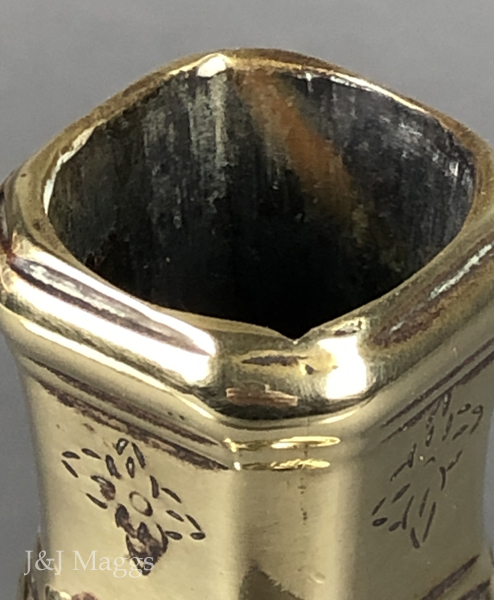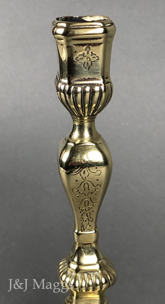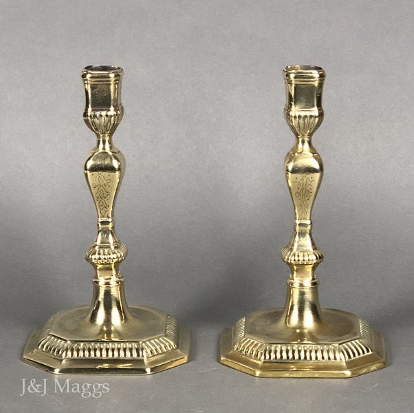 Octagonal, stepped bases, with gadrooning around the upper step support gracefully formed shafts, which were cast in two longitudinal halves and then joined together flawlessly, leaving a nearly invisible seam from bottom to top. The shafts are impressively designed, with a knop near the bottom, a baluster above it, and a shaped candle socket at the top. The knop and the bottom of the socket are gadrooned, like the base, and the baluster and the upper part of the socket are engraved brilliantly. The octagonal form of the base is continues through the entire length of the shaft.