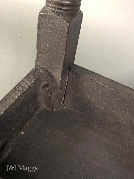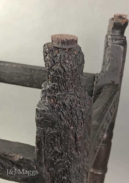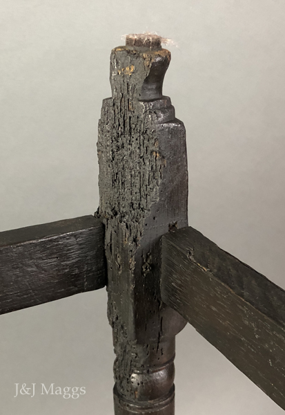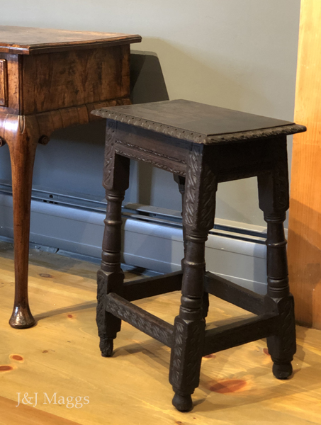 Purchased in Scotland, this distinctive stool has carving on nearly every surface. The blocks in the baluster legs, apron, stretchers, and even the edges of the seat, are covered with tightly executed carved detail. There is some wear to the feet, but all four are still present, and the stool is very tall. Its dark color is particularly striking.