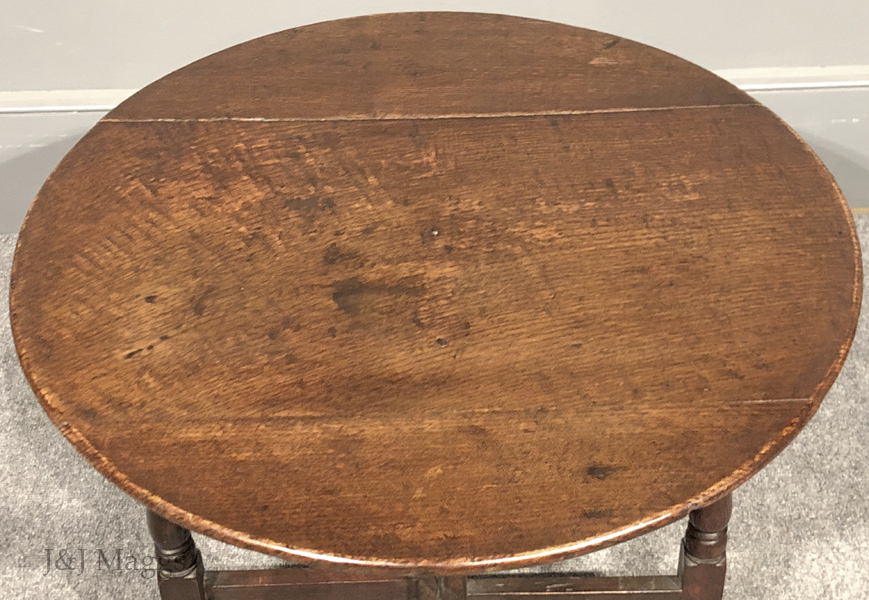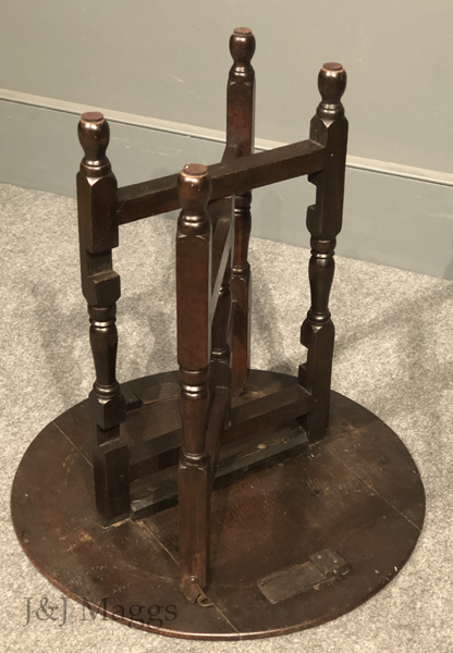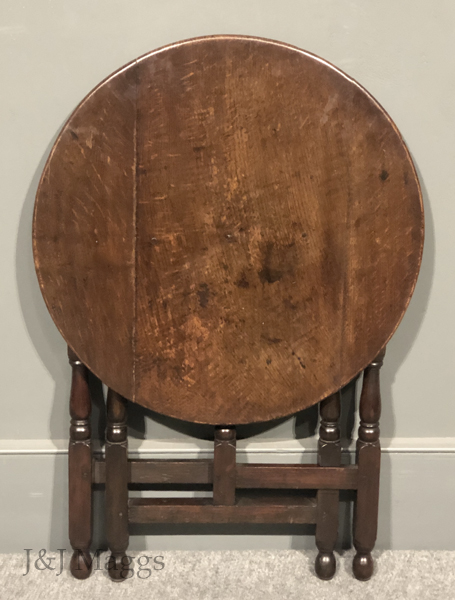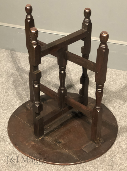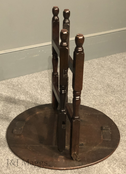 A wonderful centennial of the 18th-century collapsing tables that provided portable seating at outdoor events, consisting of two “gates” that pivot around a central demi-post, and a round top. The four legs and the center post are turned with the same patterns, while the four rails are plain. The three-board top is hinged to collapse for easy carrying or leaning when the gates are turned together.