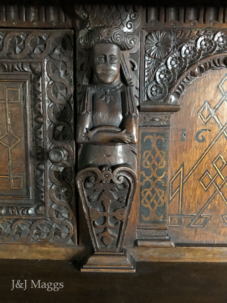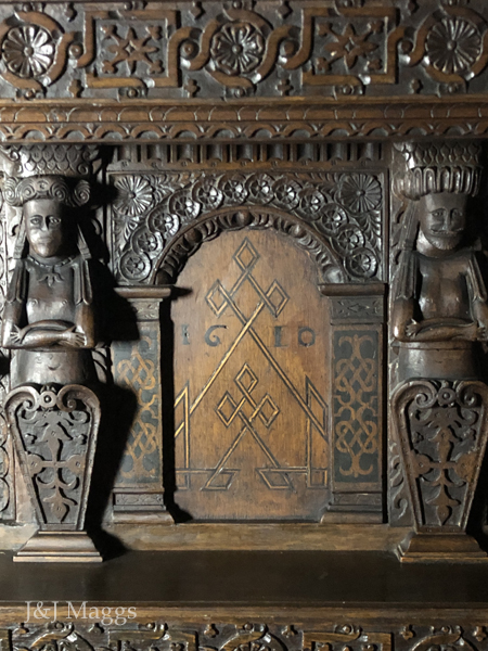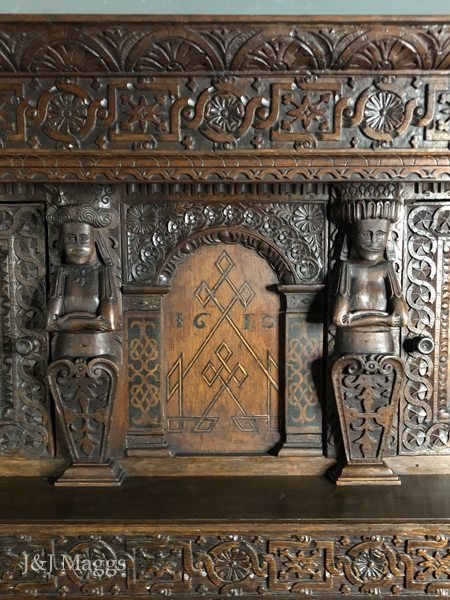 The central panel is framed by two crowned caryatids standing behind a lectern carved with festive flowers and scrolls. Based upon the date, it is possible that they represent James I and his Queen, Anne of Denmark. The floral emblem of the Danish crown is the daisy!