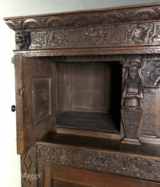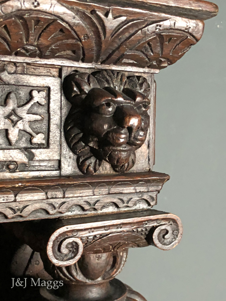 Without doubt, the most lavishly decorated court cupboard we’ve ever owned, and the quality of the carving is exceptional. The piece is in two sections, each crowned by a frieze in which alternating circles and rectangles frame three floral figures: the Tudor rose, a multi-petalled flower, perhaps a daisy; and a third, more abstract than the other two. The upper and lower friezes are identical but for the pair of lions that frame the upper.