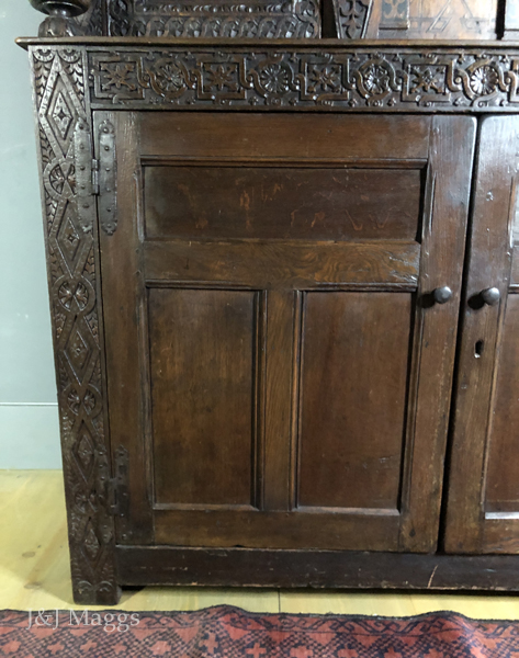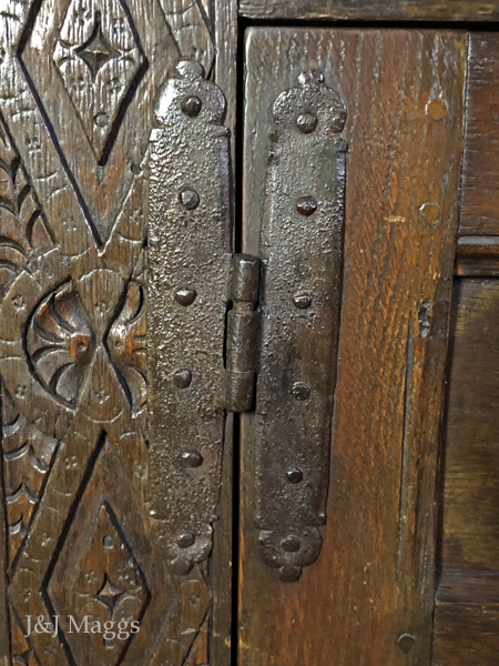 Compared to this festival of carving and inlay, the lower section is rather bland, although its side stiles are carved with the pattern of their counterparts on the upper section, and the quite plain three-panel doors are attached with foliated H hinges with crowned hearts – top of the line and original to the piece.
