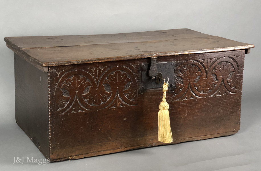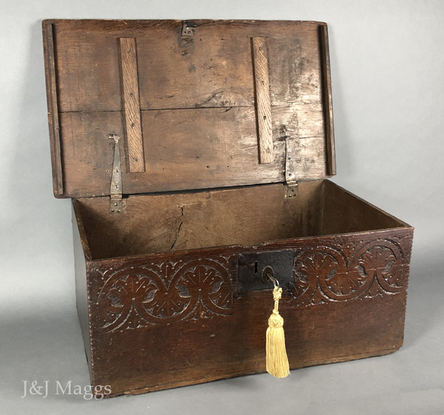 A deep box with shallow carving on its upper half and chip carving at the ends of its face. Perhaps its most remarkable feature is its back, which has bowed to such a degree that the hinges were pried from it. Fortunately, these original strap hinges were still present, although dysfunctional, and have been re-attached and are now functioning. The hasp and the working lock are also present. The outer cleats have been replaced, and two additional cleats have been added for stabilization.