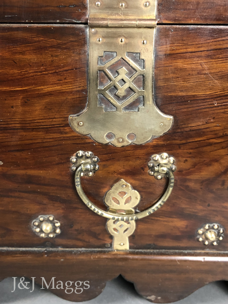 A traditional antique Korean Bandaji (“half-closing”) blanket chest, with two shallow interior drawers for storing valuables. The face is comprised of a stationary bottom board, secured by five brass fittings on each side. A string of purely decorative brasses lines its bottom, and three elaborate brass hinges connect the top to the stationary bottom, allowing it to swing forward and down to give access to the interior. At the top of this door are two bales and an elaborate, working lock. These chests are typically associated with the Joseon Dynasty; this one dates from the 19th century.