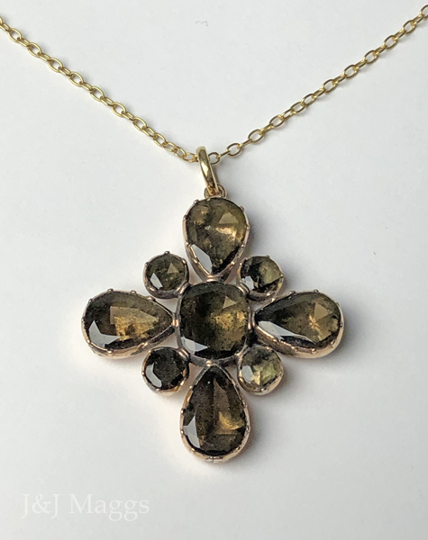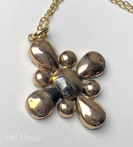 This gorgeous Georgian gold pendant has the form of a four-pointed floral/starburst design, closed-back set with 9 topaz stones in round, rectangular and teardrop shapes. The measurements of this beautiful pendant are 1 ¼” across, and 1 ½” from the top of the bail to the bottom of the pendant. These topaz stones are perfectly lovely. There is an old repair at the back of one teardrop topaz. This English or Iberian pendant has been suspended from a later gold-filled chain (18”), however it may easily be worn on a silk cord or ribbon.