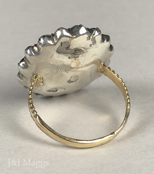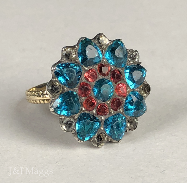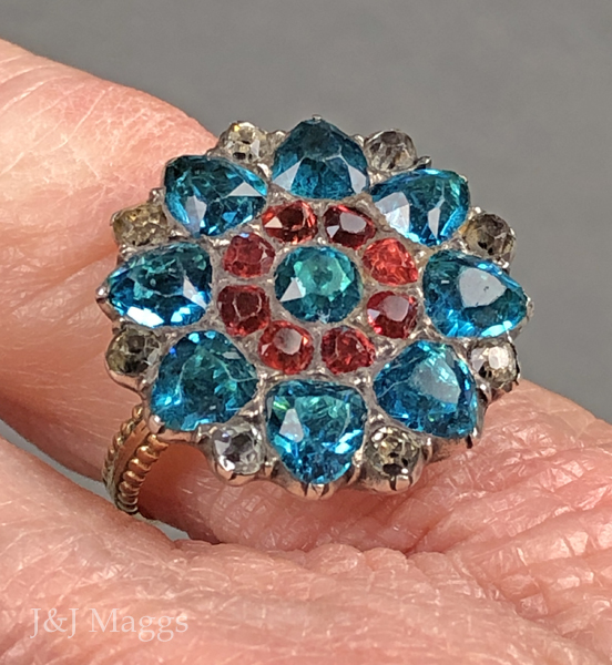 This 18th century ring is wonderful, and the colors are quite unusual. It is a Georgian floral cluster ring, with concentric circles of paste stones: white topaz, blue topaz, and pink topaz pastes, and a blue topaz paste center. The 15k gold shank joins at the shoulders, with two rows of gold beaded decoration on each side, tapering to an undecorated back, allowing for moderate re-sizing. The verso has a slight belly, typical of this era.