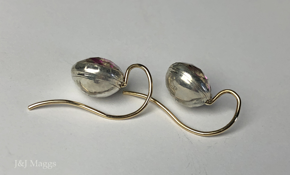This is a glorious pair of English silver and gold earrings. The starburst faceted rock crystal quartz stones have been closed-back, crimped-set in their bezels with wonderful fuchsia pink washed foils which create a stunning look as the starburst cuts reflect light upon movement. The earrings are fitted with graceful gold shepherd’s crook earwires which go into the front of the ear. Overall length of the earrings is 15/16 “ from the top of the earwires. Each crystal is 11mm in its mounting. English, ca. 1790, these are bright, clean, and sensational!