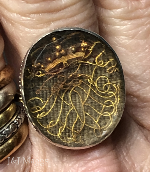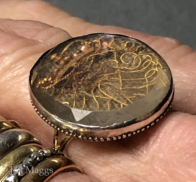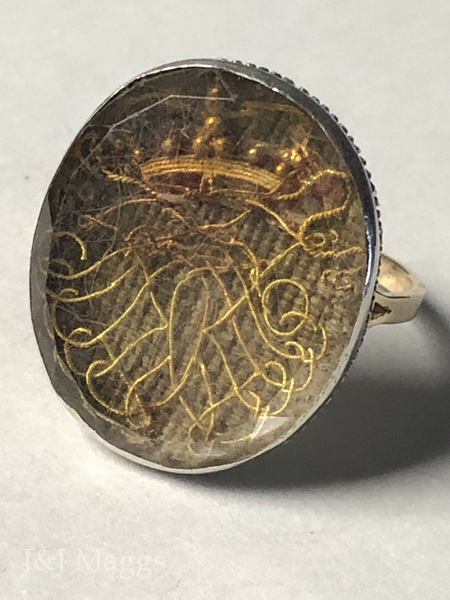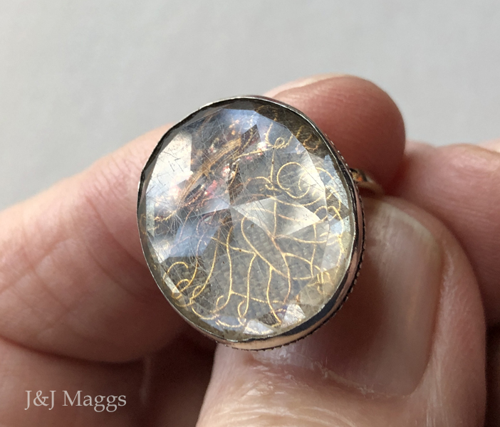 These amazing pieces of jewelry were made up of clear, faceted rock crystals, enclosing love tokens (pieces of ribbon, cloth, or hair), with initials (sometimes the King’s monogram) worked in fine gold wire into cyphers on top, and a foil backing (rose, pink, red, silver, sometimes blue or green, in color). The whole mounting was closed-back set in silver or gold. This did not open but was rubbed over the crystal or sealed in a crimped manner.