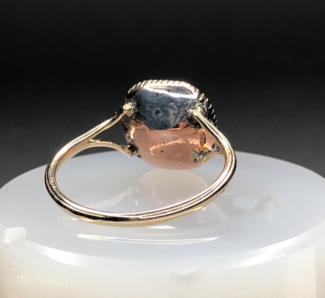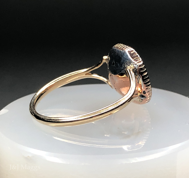 A glorious gold ring, closed-back set with a double starburst faceted diamond paste in a fine dogtooth bezel (12mm square). It is joined at the shoulder by a gold bifurcated shank. The ring is English, size 8, and in beautiful condition, sparkles galore!
