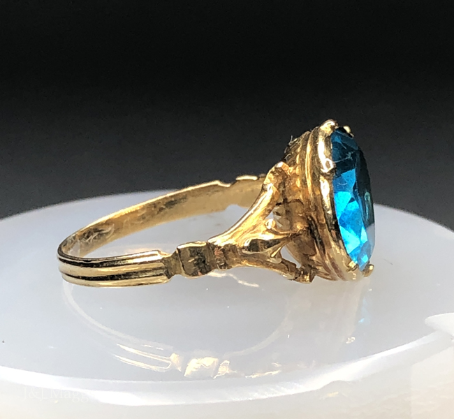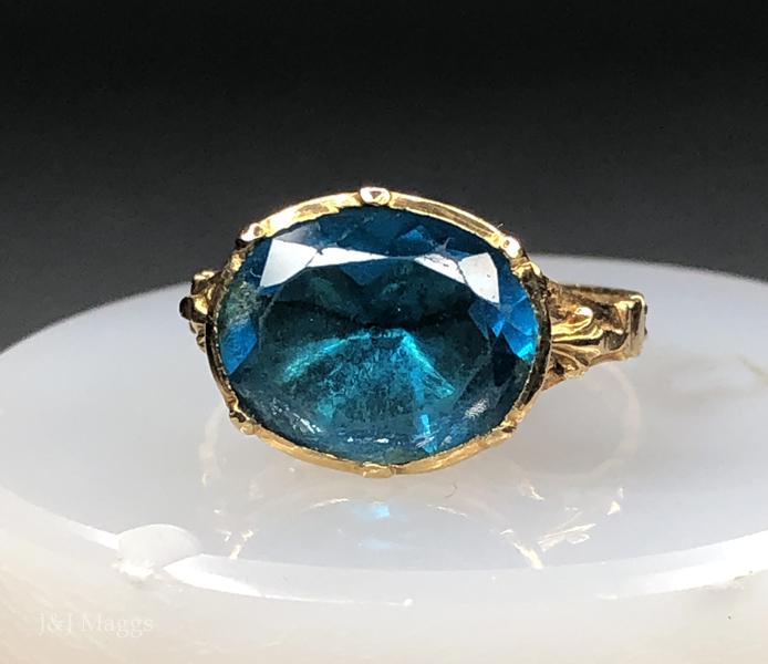 A stunning 17th century ring created in 22k gold. The head of the ring has been closed-back set with a sparkling, oval faceted aquamarine paste stone of a stunning color, with a single angled cut to the girdle. There is notable decorative open work bridge and arched design to the shoulders and stepped engraving at the termination of the shoulders leading to a ribbed back shank. The rounded belly of the verso of the central gold mount has a rayed, or basket back and the ribbing is well defined. This lovely ring is English and currently measures size 6 ¼ on a grooved mandrel. The mounting’s shaped bezel holds the aqua paste over foil and is crimped at six points. This ring is rare, and amazingly lovely.