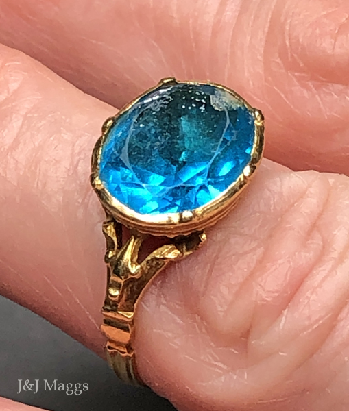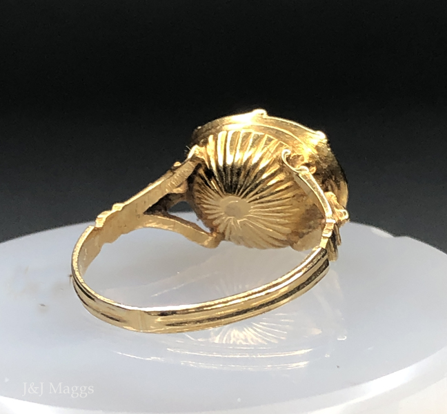 Glowing 17th century 22k gold oval aqua paste rayed back ring