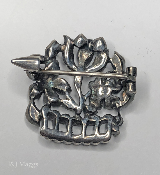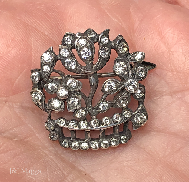 A lovely Georgian silver diamond paste giardinetti* brooch in the form of a pierced basket filled with flowers. Bright and sparkling, there is a pin stem catch which goes into a cone-shaped clasp.