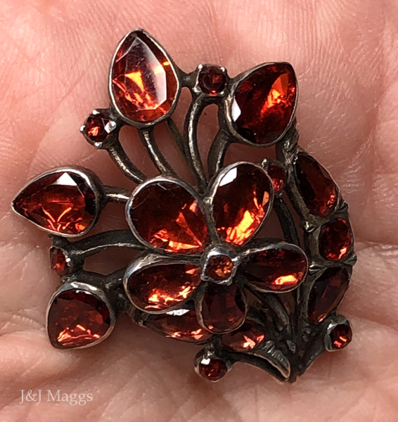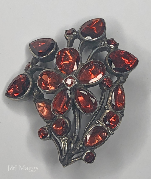 A beautiful sterling silver floral brooch set with garnet paste stones in rubover settings, a large flower, and several buds and leaves. Hallmarked London T for 1954, and H.A.L. for Harold A. Lazarus. The brooch measures 1 ½” overall height and 1 3/16” in width. There is a locking pin stem on the verso. It is rare to find his work. [For similar examples of Lazarus paste, see Antique Paste Jewellery, 1970 by M.D.S. Lewis.]