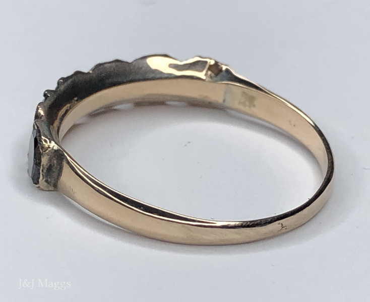 A lovely half-hoop ring in gold, closed-back set with six flat-cut garnet stones (4mm) paw-set in gold bezels. A simple, tapered D-shaped gold band joins at the shoulders. Currently a size 6½, this English, Georgian ring is a wonderful addition to a stack, or beautiful worn alone.