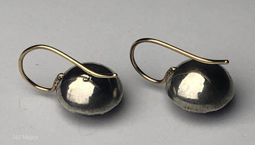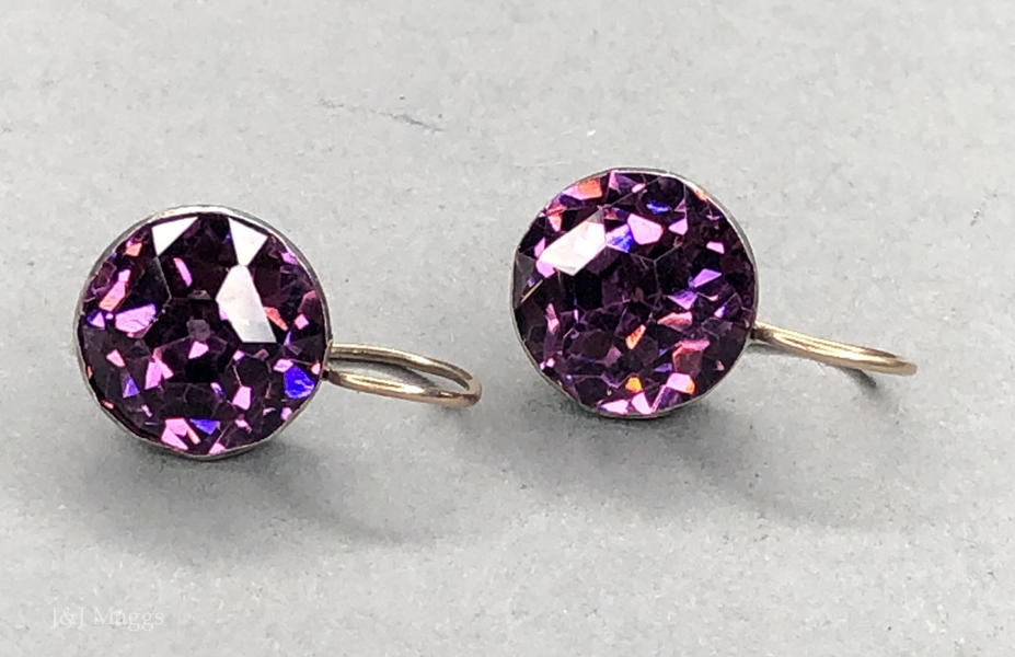 The sparkling starburst faceted amethyst pastes are lovely, and measure 11mm in diameter. They are closed back, bezel-set in silver with rounded backs typical of the Georgian period. They have gold shepherd’s crook earwires which go in the front of the ear. They measure ⅞” from top to bottom.