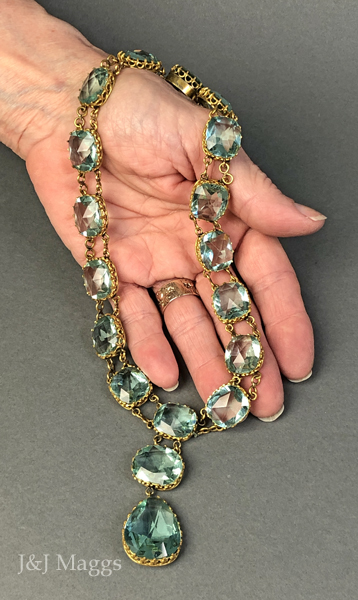 This stunning Georgian rivière necklace is crown-set in open back gilt with 16 rose-cut aqua paste stones (14x16mm). The rivière measures 16 inches, including the matching stone clasp (17x19mm). The pendant is made up of two stones: the upper one measures 15x18mm, and the teardrop below it measures 22x26mm. There is a rounded slide-in tongue which clicks and holds the clasp securely. This glorious rivière necklace is English, and dates from the early 1800’s. Wearing this, you will feel like royalty.